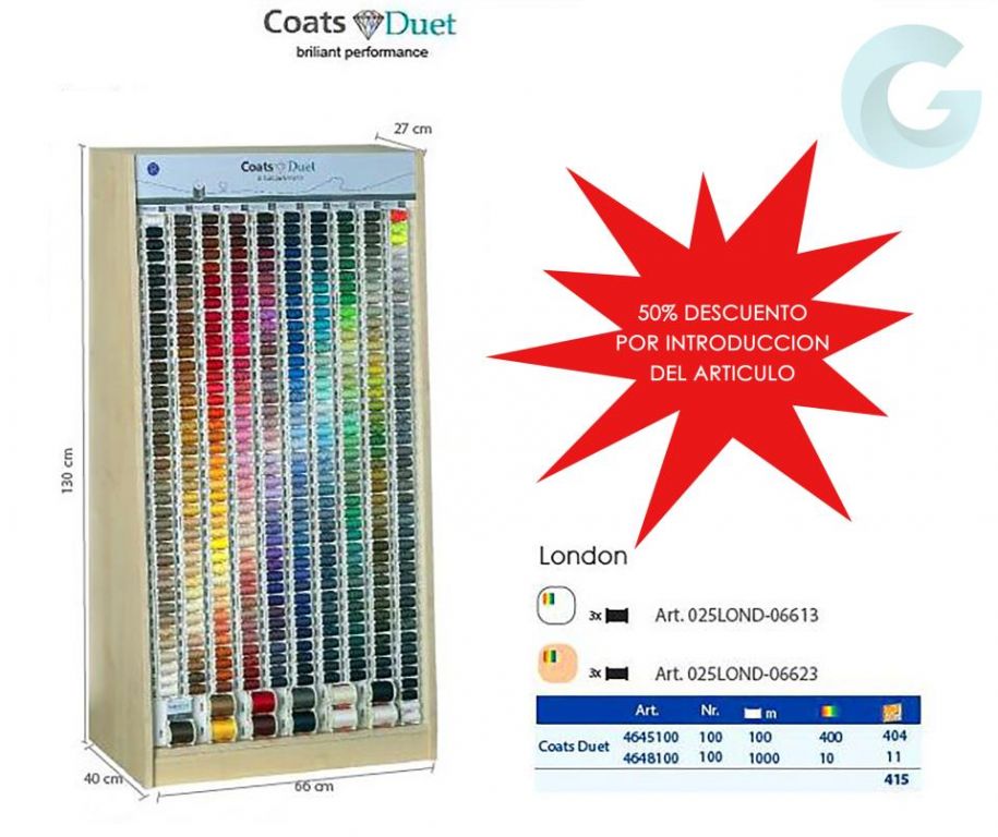 Mueble MEZ DUET de 130cmX66cmX40cm, con 400 colores, a 3 bobinas por color, total 1212 bobinas de 100 metros incluidas. O bien, 10 colores, a 3 bobinas por color, total 33 bobinas de 1000 metros incluidas.