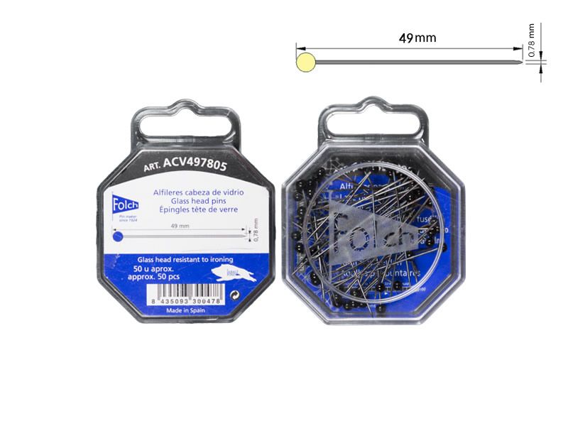 Alfiler cabeza de vidrio negra especial para bolillos, 49mm de largo y 0.78mm de diametro. Venta por cajita de 100 alfileres.