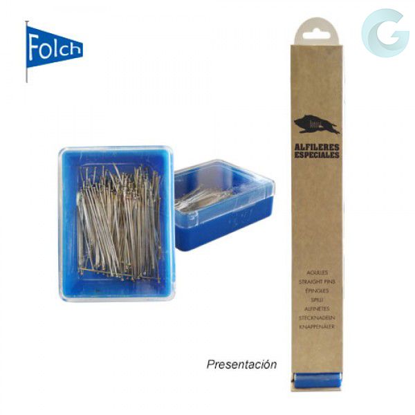 Alfiler acero niquel nº8 tamaño 34mm x 0.65mm. Unidad de venta: 20 cajitas plasticas de 200 alfileres (16 gramos) cada una en un expositor de cartón.