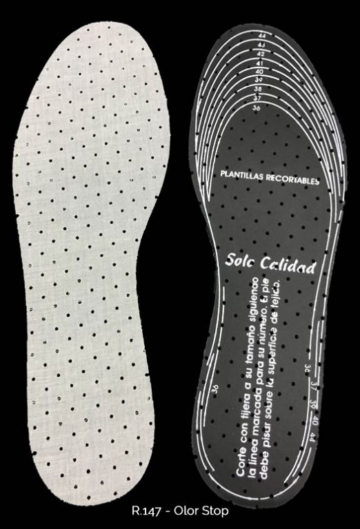 Plantilla Olor Stop fabricada en espuma perforada de látex con carbón activado y tejido de viscosa. Absorben el sudor y los malos olores. Recortables de la talla 36 a la 45. Venta pack con 1 par.