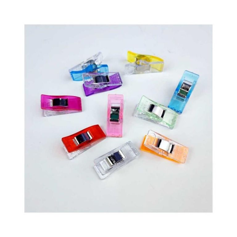 Pinzas patchwork para tela, de 25x 10mm. Ideales para sustituir a los alfileres en la costura de dobladillos, bieses, tejidos plastificados, vinilos, cuero, terciopelo y tejidos gruesos. Venta en bolsa de 100 unidades surtidas.