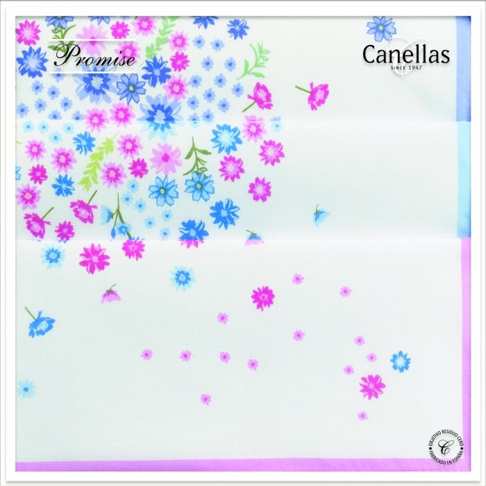Pañuelo señora CANELLAS estampado con fondo blanco y pespunte, 100% algodon. Venta en estuche de 6 pañuelos surtidos en dibujo(el dibujo puede variar).