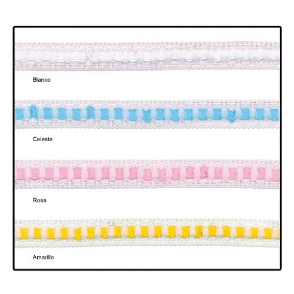 Encaje pasacintas con cinta Dismer, de 12mm de ancho aprox. 100% poliester. Venta por pieza de 10 metros.