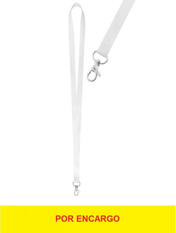 Cinta poliester blanca para landyards porta tarjetas de 15mm, disponible tambien en 20mm y 25mm. Mosqueton no incluido. Venta por piezas de 100 metros.