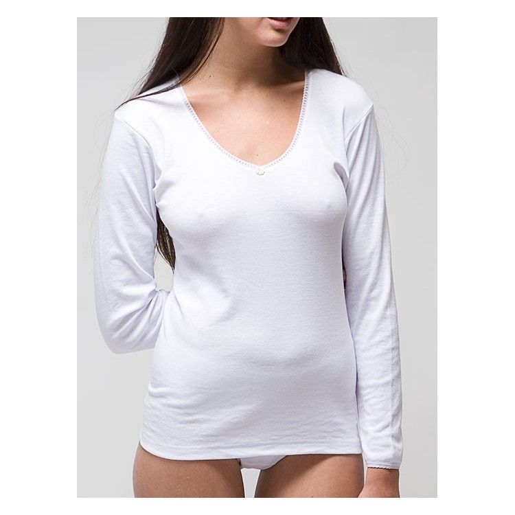 Camiseta de señora termal lisa de manga larga con cuello de pico, 50% algodón 50% poliester. Sin costuras, afelpado para invierno. Venta en caja de 6 unidades.