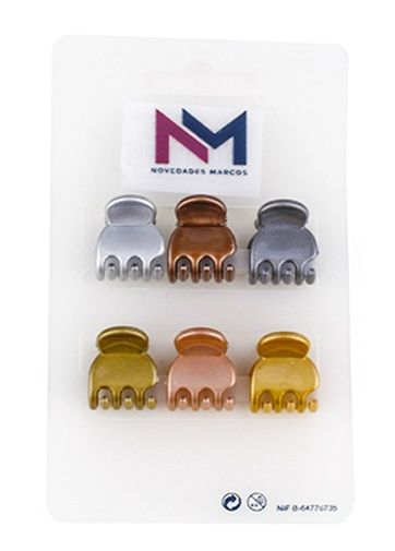 Pasador pinza cabello en colores metalizados. Tamaño 15mm. Venta por 3 pack de 6 pinzas cada uno, total 18 unidades.